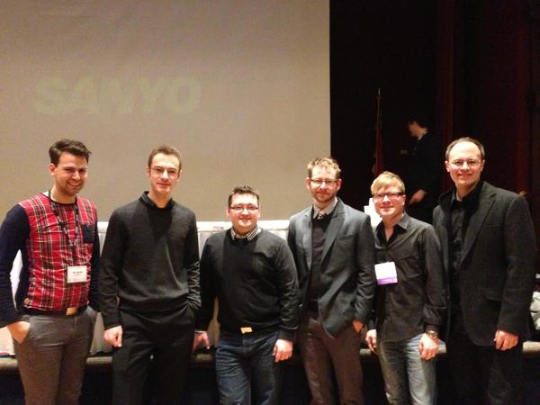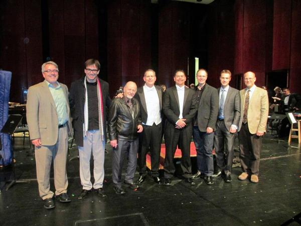 Scott McAllister, Luis Serrano Alarcon, Michael Colgrass, Eric Wilson, Isaiah Odajima, Steven Bryant, Scott Lindroth following the Baylor Wind Ensemble performance at the 2013 CBDNA National Convention in Greensboro, North Carolina.