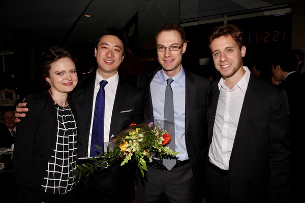 Trio Céleste members Iryna Krechkovsky, Kevin Kwan Loucks, and Ross Gasworth with Paul Dooley after the premiere of Concerto Grosso at Carnegie Hall in April 2017.